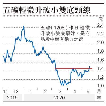 商品需求一定會復蘇,問題是以U形、V形還是W形。市場看法是U形。商品股現時仍貼近低位,反映市場沒有什麼期望,下跌風險相對有限。若復蘇力度漸增,則股價有望水漲船高。走勢上,五礦(1208)昨日輕微升破小雙底頸線,是商品股中較有動力之選。