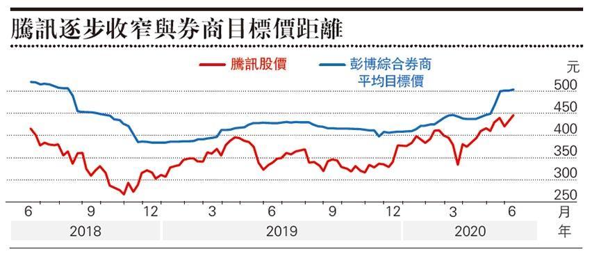 走勢上,騰訊有機會出現小雙頂,但小回可以守425元,將解除威脅,後市料可反覆上試450元或465元阻力。從另一角度來看,將騰訊股價與彭博綜合券商目標價平均比較,近兩年股價較目標存有折讓,由最多三四成至半成不等。騰訊股價低位大幅反彈,拉近與目標距離,以平均目標504元計,倘若折讓可以進一步收窄至半成(假設目標價不變),將可高見480元,接近2018年高位476.6元水平。