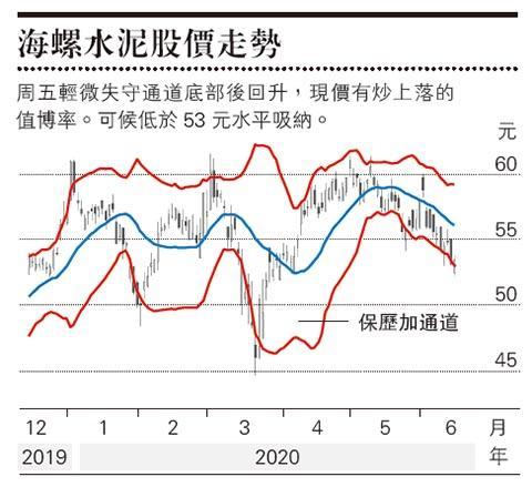 但要留意,每年6月中開始全國進入雨季,工地施工困難,因此也是水泥的淡季。即使廠商都會在生產上作調節,往往在這個時段進行維修,但每年6月中到8月下旬價格還是會下降,整體降幅介乎3%至5%,然後就進入旺季,價格持續上升直至年底,過去兩年升幅均達10%至15%。近期價格回落,但未有偏離季節性走勢,而水泥股受壓,海螺(0914)率先由60元(港元‧下同)水平回落,周五輕微失守通道底部後回升,現價有炒上落的值博率。可候低於53元水平吸納,博回升至56元至57元。