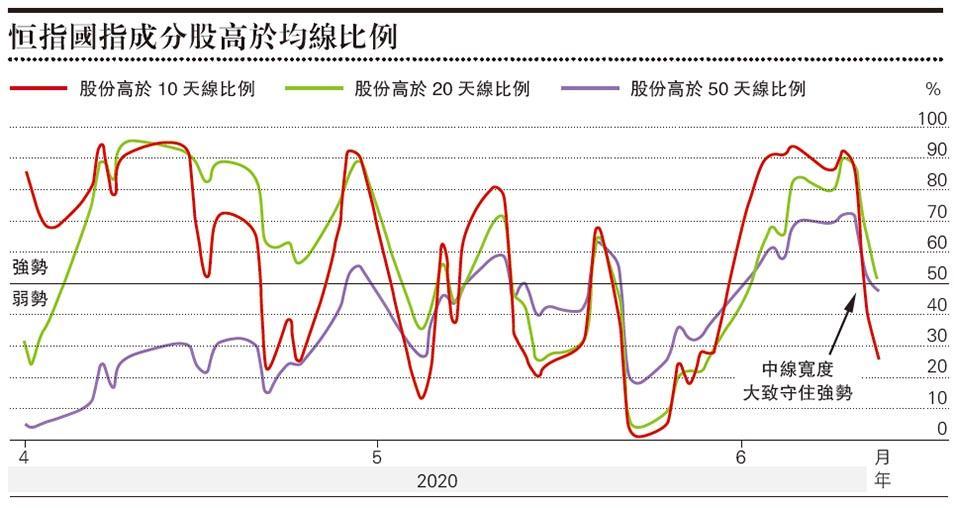 趨勢寬度亦支持中線向好趨勢,恒指國指成分股高於10天線、20天線及50天線比例,上周由高位七至九成回落,周五大致還有一半股份高於20天線、50天線,保持中線向好趨勢。