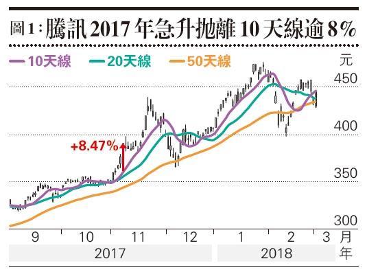 論新高,最矚目應該是兩大藍籌股騰訊及港交所,前者升破2018年高位476.6元,後者除超越2018年高位306元,更突破2015年高位311.4元,兩者均創上市新高,向上無蟹貨。騰訊急升拋離10天線,高出10天線逾9%,最近兩次急升高出10天線逾8%,分別為2018年11月及2017年11月7日,前者為低位大彈,後者處於上升趨勢,較有參考價值;騰訊2017年11月7日急升後高位整固,之後再大漲,累漲逾一成才現大型調整(圖1)。