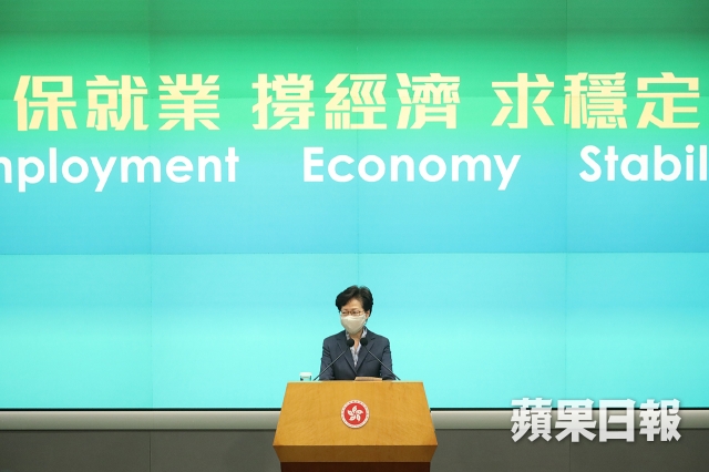 政府的「保就業」計劃,第一輪頭二十名受資助最多的公司,有三間竟是受疫情影響程度低的會計師樓。圖為行政長官林鄭月娥。 資料圖片