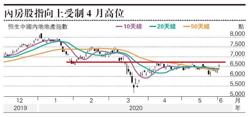 從反映大型內房的恒生內地地產指數來看,昨天急升,一口氣重上10天線、20天線及50天線,初步走出4月底以來調整,上望4月高位阻力仍有待突破,可候小回吸納。大型內房以融創(1918)急升後仍相對落後,可小注博有能力升破35元,並設低收10天線32.5元止蝕。強勢內房股則有旭輝(0884),該股昨曾升穿4月高位,之後回順守穩6元收市,入市倘低收5.9元可先離場。