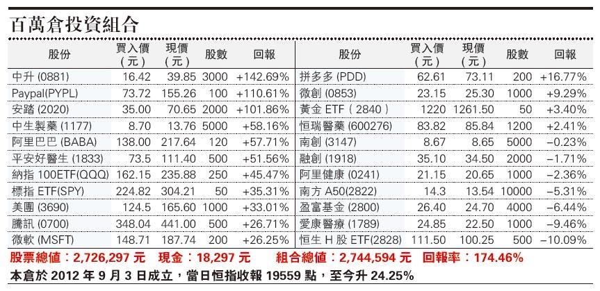 本周會沽出5000股安踏(2020),買入20股3x Long Gold ETN(UGLD),增加黃金的部署。