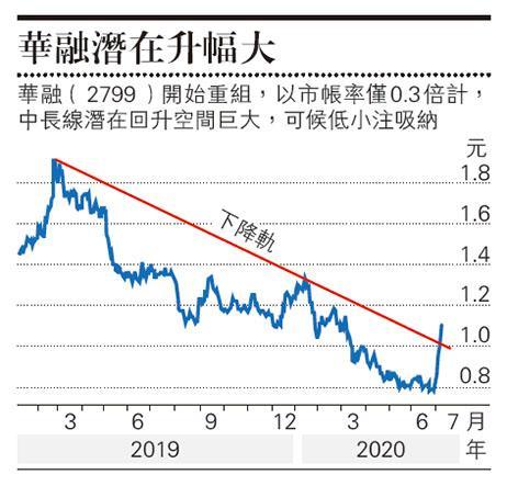 但近日旗下的華融金控(0993)擬私有化華融投資(2277),事件反映華融內部開始有重組方案,著手清理賴小民遺下的手尾。始終華融資產豐厚,也是重要的資產管理公司,一旦重新出發,以0.3倍至0.4倍的市帳率,重估空間相當大。走勢上,股價已升破2019年初延伸出的上升軌,可候低在1.05元小注買入,投機博步入升浪。