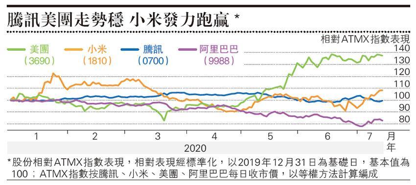 若以ATMX(阿里巴巴(9988)、騰訊(0700)、美團、小米(1810))為首科技股組成ATMX指數(見圖),今年來,騰訊相對指數表現最為平穩,與指數沒有明顯跑贏或跑輸趨勢,阿里巴巴相對指數下滑持續跑輸;近一個月,美團相對指數也變得平穩,只有小米相對指數持續向上跑贏。因此,若希望跟得上科網熱潮,可趁騰訊回調吸納,預料短線於500元有良好支持,進取可吼小米。