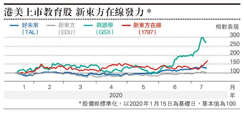 相比美國上市的內地教育股好未來(TAL)、新東方(EDU)、跟誰學(GSX),新東方在線只是剛走大型橫行區,仍有追落後空間。今年上半年大部分時間,新東方在線與跟誰學都跑贏同業,兩者卻互有領先,難分別勝負。