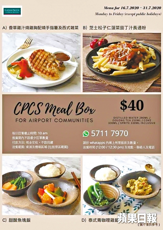 嘅人士希望輕易購買外賣午餐及保持社交距離,所以由今日開始為機場同業推出午餐外賣服務。每逢星期一至五,只要喺上午10時前透過短訊訂餐,便可於同日中午時段收取外賣午餐。