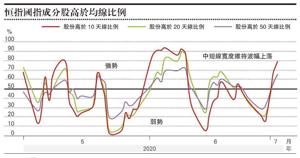 不過,要留意,趨勢寬度仍然處於近月大幅波動階段,未來需要更多考驗,以確認中線向好趨勢形成。6月上旬,恒指國指成分股分別高於10天線、20天線比例升至九成,高於50天線比例曾高於七成;恒指及國指上周五升穿6月上旬高位,創3個半月新高,但成分股分別高於10天線、20天線、50天線比例分別為79%、65%、65%,目前大市向好寬度不及6月。此外,10天線、20天線、50天線比例上周曾跌至兩三成水平,繼續在5月以來兩成至八成區間大上大落,而未能守在五成以上的強勢區,向好寬度承接力不強。
