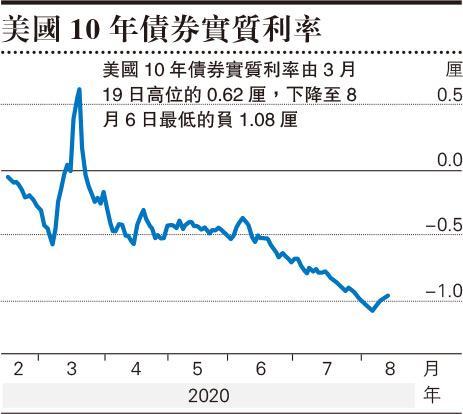 美國10年債券實質利率由3月19日高位的0.62厘,下降至8月6日最低的負1.08厘。利率尤其是實質利率是所有資產的估值基礎,當實質利率下降,所有股票都變得廉宜,因為現金流折現回來的價值會增加。沒有現金流的資產,例如黃金白銀也會因為實質利率下降而減低持有成本和增加估值;美元的價值也隨實質利率下降而下降;債券也因為實質利率向下而受益。