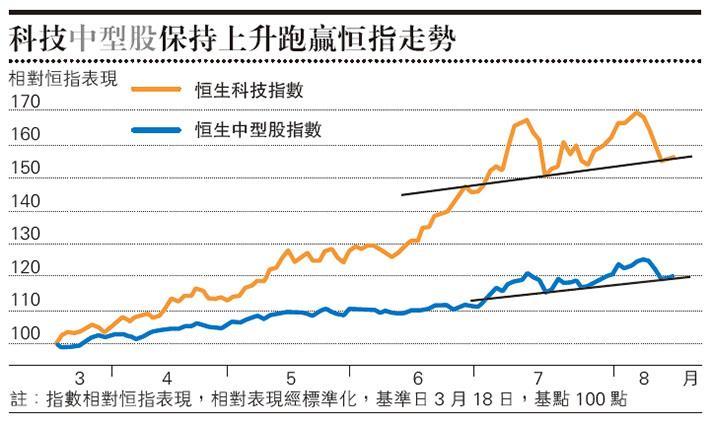 另一邊廂,火熱或強勢行業或股份上周受壓。從大勢來看,恒生綜合中型股、小型股指數上周五計較3月低位(收市計)累升四成,今年迄今累升4%及9%,恒生科技指數3月低位至今升76%,今年累升49%,三者皆明顯跑贏恒指(3月低位至今累升16%、今年累跌11%)。不過,今年來大部分時間領漲的指數繼7月初急回之後,上周再一次下挫,中型股、小型股指數上周曾經最多跌4%,低位反彈後全周仍要跌1.24%、1.85%;科技指數更一度跌逾7%,全周跌近半成。