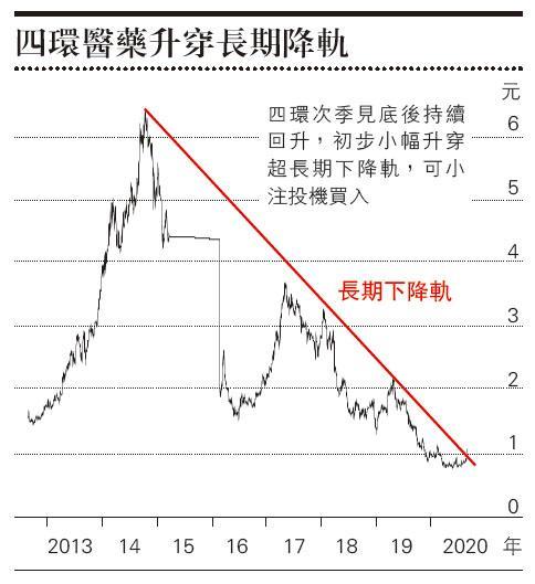 四環醫藥(0460)近年長跌長有,由2015年停牌前的高位6元以上,到今年第二季低見0.58元,跌幅超過90%。四環是當年的醫藥明星股,主攻心血管藥物,但早年被指向分銷商賄賂、審計拒絕在年報簽名,遭港交所勒令停牌。復牌後股價暴跌,管理層宣布回購計劃,配合2017年的牛市,股價由不足2元回升至3.5元水平。但始終缺乏基本因素支持,兩票制下更著重藥物效果,股價又進入漫長跌浪。