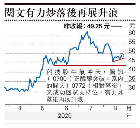 另外,假如騰訊能破頂,同系的股份也可留意。閱文(0772)是相對落後的科技股,此前更換管理層後,市場憧憬能與騰訊更深度融合,股價抽升,但業績後管理層亦承認有很多問題有待解決,股價又持續回落,一度低見43.85元。走勢上,已回試了支持位43元,8月也形造了一個小雙底,有條件隨科技股展升浪而再開車。