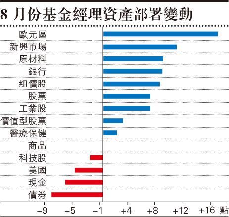 【專訊】美林美銀基金經理8月份調查顯示46%被訪者認為股市處於牛市(7月時候時40%),堅持股市仍是熊市場反彈的由47%下降至35%。70%被訪者預期經濟轉強,是2009年12月以來最高數字;57%相信公司盈利會上升。調查結果是基金經理看好比率是20202年2月以來最高。
