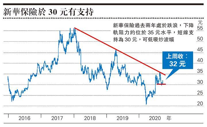 策略上,平保以外的內險股今年都以儲蓄計劃為主打,在內地存款利率低企下,每月保費收入增長都較快,新華年初至今就有雙位數字增長,也是短期較高啤打值的選擇。集團股價7月份隨大市抽升後回落,低位大致守住30元,高位則達35元至36元。就算未能展升浪,基於資金流向落後股,估值低殘也未有反映未來12個月的復蘇潛力,至少也有條件炒上落,現價博短線反彈有一定吸引力。