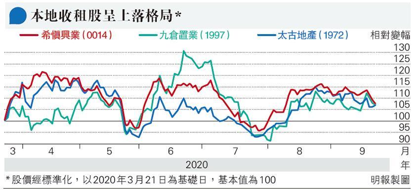 若將本地收租股太古地產、希慎(0014)、九倉置業(1997)近半年的股價標準化及比較(基礎日3月21日,基本值100,附圖),3股近半年主要在95至115上落,中位約105,太古地產昨為107,接近中位水平。走勢上,太古地產上月升至21.6元調整,近日回落至50天線約20元漸有承接,可以吸納;短線可設低收19元止蝕。