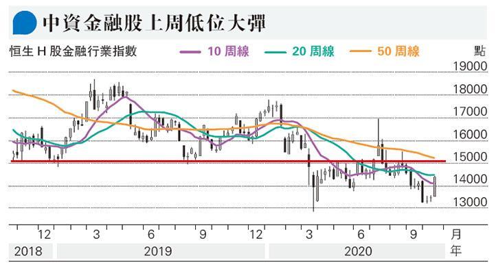 中資金融大漲,從恒生H股金融行業指數來看,表現更佳,全周升6.9%,升穿10周線;對上一次升逾6%為2019年2月22日的一周,但當時指數處於50周線之上,屬強勢向上;對上一次低位漲逾6%、升穿10周線為2018年11月2日的一周,當時大陽燭升穿10周及20周線,之後回試低位,因此低位大彈未必利好後市表現。以圖論勢,H股金融指數即使進一步反彈,料於50周線或前低位約15100點將有龐大沽壓,該水平與上周五有約半成距離。