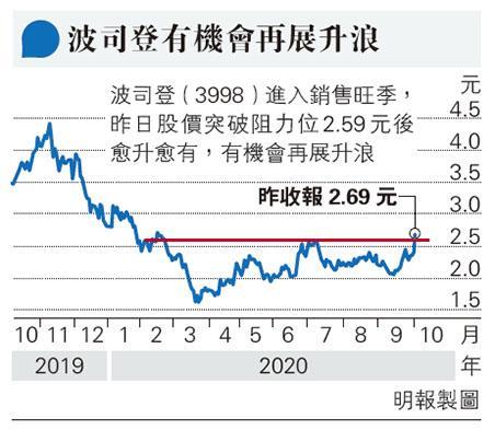 波司登2018年至19年曾經大幅炒上,由0.7元水平起步,最高升至4.42元。集團當時成功清理庫存和銷售渠道,又推出中高檔次品牌並大受歡迎,獲市場大舉重估。但兩年輝煌過後無以為繼,股價今年首季跌回1.6元水平,近期才回升。集團主打羽絨服裝,現在臨近冬天踏入旺季,加上資金喜歡消費零售股,有條件再受追捧。綜合市場預測,今明兩年預測市盈率為16倍及13倍,若獲重估的話,上升空間頗大。只是上次高峰期才1、2年前,需求能否配合是一個變數,但小注一試無妨。