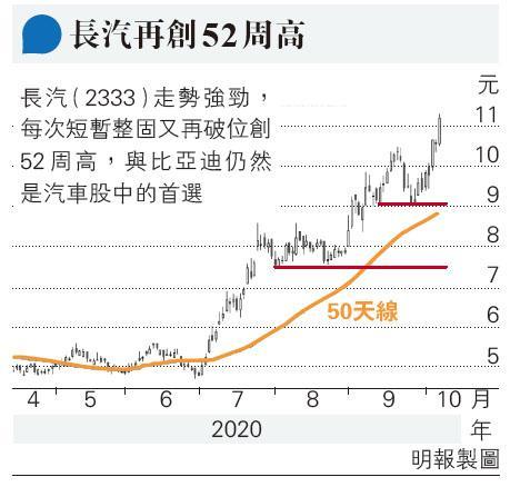 汽車股個別發展,吉利(0175)先跌後回穩,長汽持續強勢再升5.5%創52周新高。長汽的主題是3個技術平台,但其實尚有近期熱炒的氫能源概念。長汽旗下的未勢能源,於9月中發布包括95kW乘用車燃料電池系統發動機、最大可拓展至150kW的平台化燃料電池堆及70MPa高壓儲氫瓶閥及減壓閥等核心產品,同時宣布長城汽車首款燃料電池SUV將於2021年實現量產。