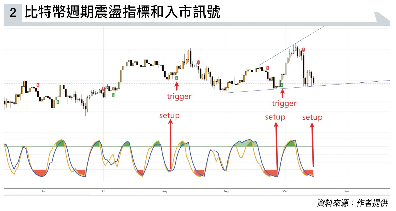 為了展示給大家,筆者用簡單的週期震盪指標和入市信號如圖表二可見,當比特幣進入了週期底部區域時形成setup,然後等待滯後指標發出買入訊號,即可確認買入。