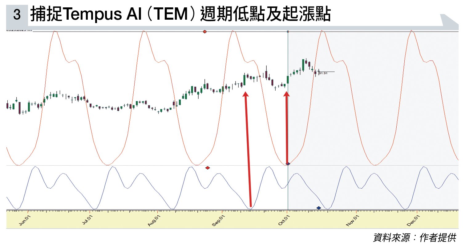 (二)震盪市的操作心法:以Tempus AI Inc(美股代號:TEM)為例子。不是所有市場都像比特幣一樣,處於單邊趨勢市。許多股票,例如筆者在7月中部署的TEM,就展現了典型的「震盪市」性格。而筆者的週期指標,亦不斷捕捉到週期低點以及起漲點,如圖表三。