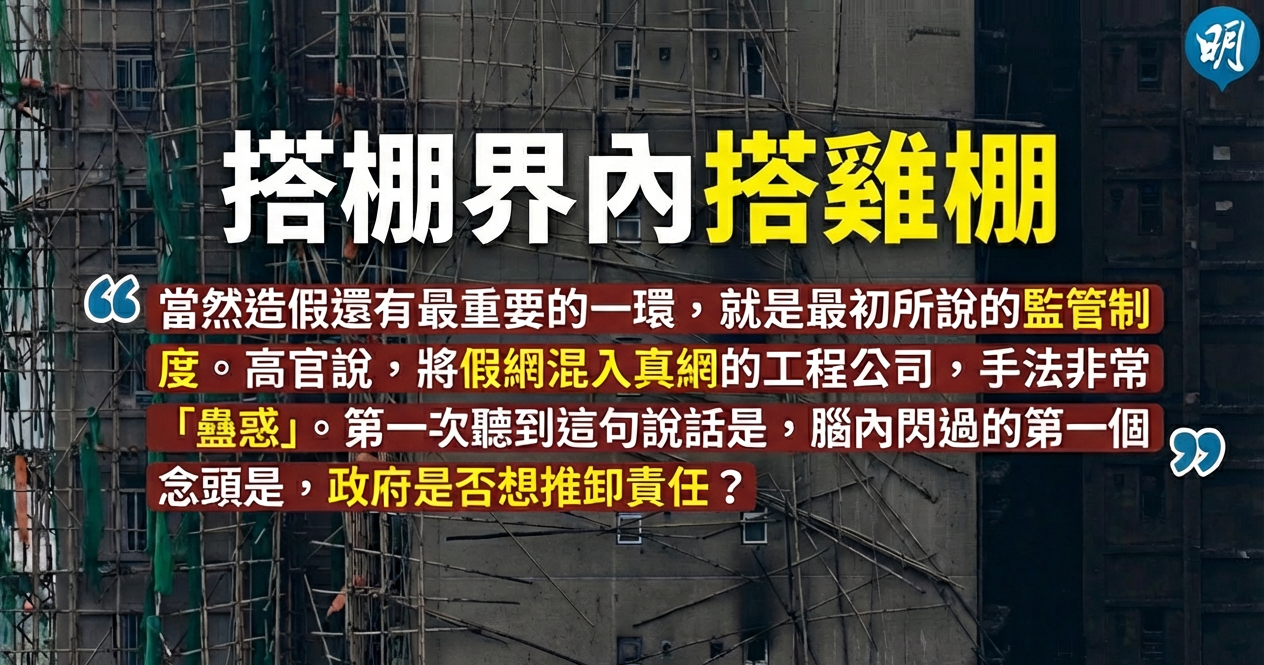 當然造假還有最重要的一環,就是最初所說的監管制度。高官說,將假網混入真網的工程公司,手法非常「蠱惑」。第一次聽到這句說話是,腦內閃過的第一個念頭是,政府是否想推卸責任?因為從字面解讀,高官的言下之意,是因為別人存心欺騙,即使監管者「睇漏眼」,也是情有可原,但這是強烈不可接受的。早幾個月的政治買假水風波也一樣,政府解說發生事故原因,也是說別人存心欺騙,言語間也散發出「看不出來也很合理」的味道。