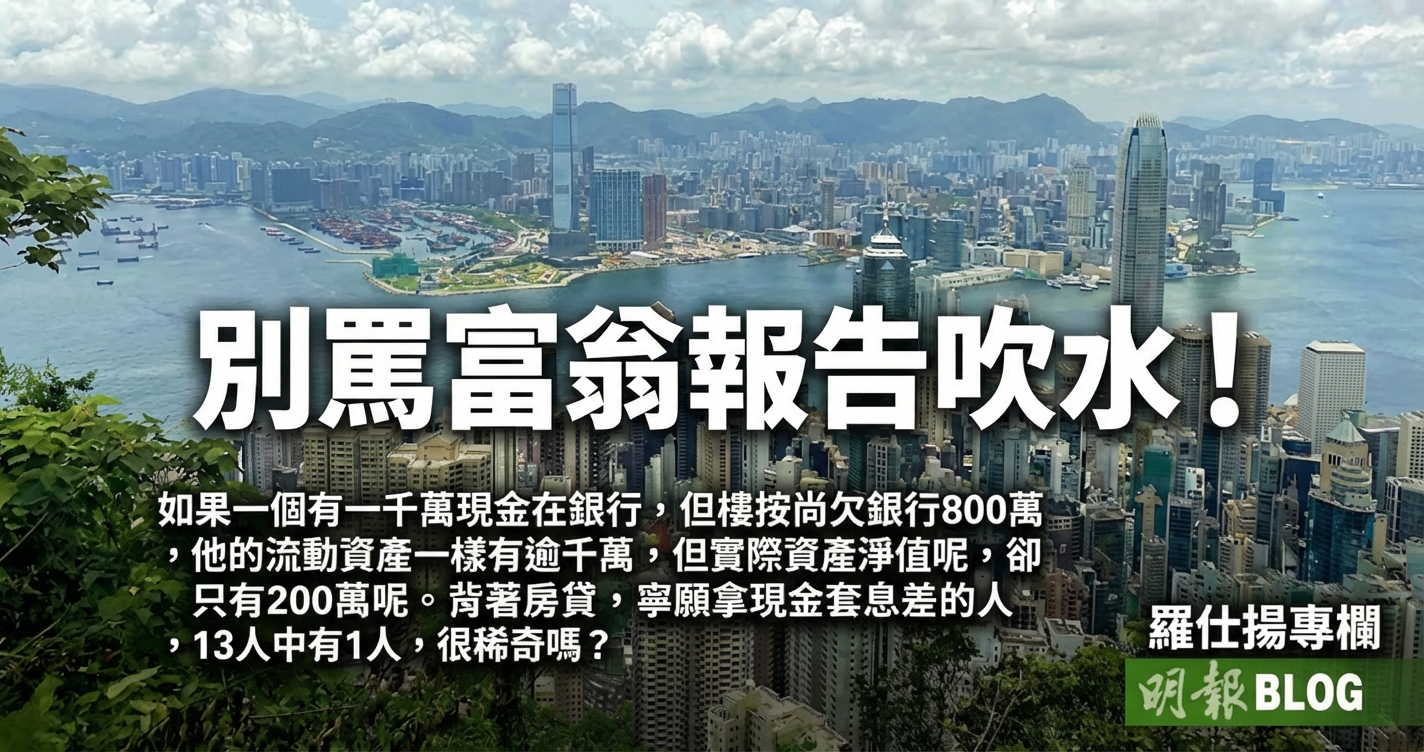 況且,千萬流動資產也不代表甚麼,有千萬流動資產,可以同時有幾百萬負債。大部分香港人,人生最大的投資,就是物業,人生最大的負債,就是樓按。無論息口高低,總有不少人就算有現金,也不會還樓按,因為總有方法套到息差。報告的千萬流動資產,沒有計物業價值,亦沒有計按揭貸款。如果一個有一千萬現金在銀行,但樓按尚欠銀行800萬,他的流動資產一樣有逾千萬,但實際資產淨值呢,卻只有200萬呢。背著房貸,寧願拿現金套息差的人,13人中有1人,很稀奇嗎?
